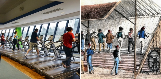 Прототип бігової доріжки винайшов Вільям Кьюбитт в 1817 році для виправлення ув'язнених, а заодно для подрібнення зерна на млині. Вони трималися за палицю і забиралися по лопат, для чого потрібно було постійно піднімати ноги.