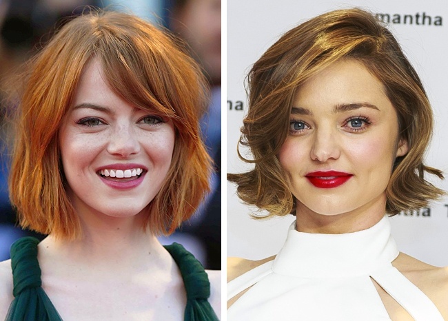 «Ляльковим» особам, як у Емми Стоун і Міранди Керр, відмінно підійде боб класичної довжини до вуха або підборіддя. Буде здорово, якщо ви доповніть укладання недбалими пасмами.
