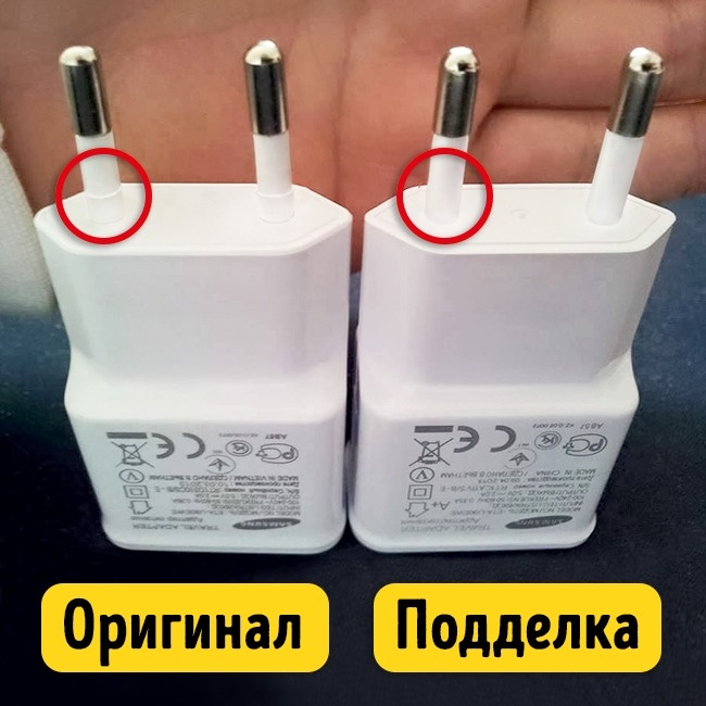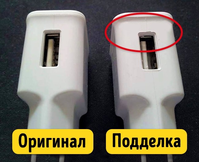 В фірмових «зарядках» ви не знайдете швів між пластиком різних кольорів, чого не скажеш про підробку. Пам'ятайте: бренд повинен відповідати за вашу безпеку при використанні пристрою. Бо оригінал відрізняється акуратними металевими наконечниками, якісної ізоляцією і шліфуванням.