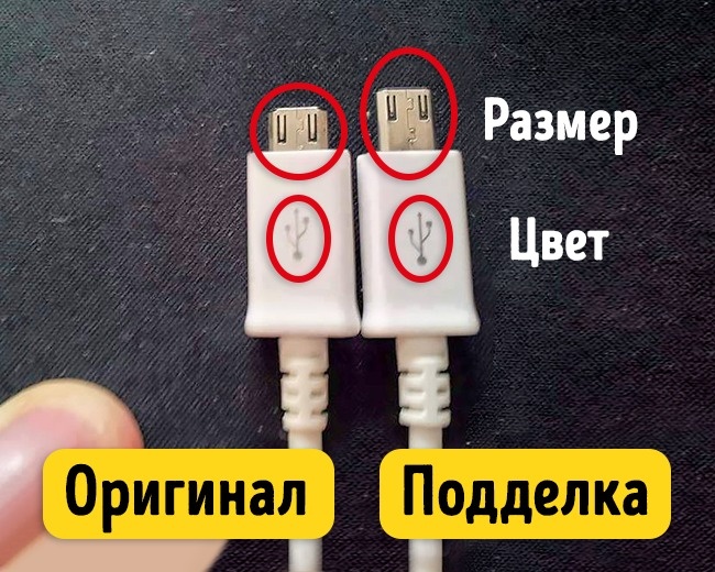 Якість проводів — один з найбільш явних відмітних знаків підробки. В оригінальній версії вставлений кабель щільно і рівно примикати. В підробці ви побачите неправильний кут і розхитаність, а іноді довжина штекера зовсім не співпаде з глибиною роз'єму.