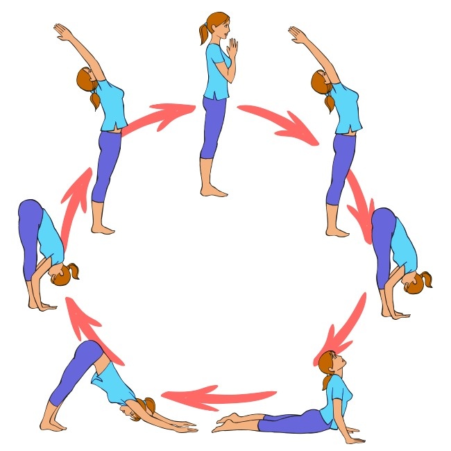 Як робити: Індуси радять перед виконанням всього комплексу завчити кожну позицію окремо і не забувати стежити за диханням. Дивіться на картинку. Починаючи з верхньої пози стоячи, плавно переходьте до наступної. Повторіть комплекс 2 рази, змінюючи ногу в позах. Повний опис кожної пози і черговості виконання можна знайти тут.