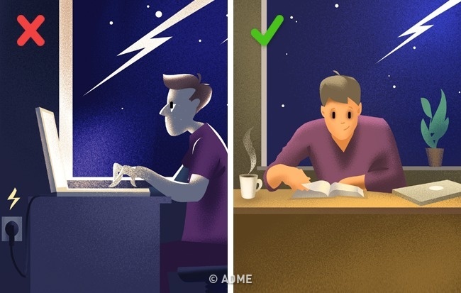 - Коли наближається гроза, вимкніть комп'ютер, вимкніть ноутбук від мережі і, якщо є кабельний інтернет, і від'єднайте кабель. Це не міф, техніка під час грози може випробувати на собі всю міць природи. Мережеві фільтри, що захищають від перенапруги, навряд чи в змозі протистояти блискавки, чия потужність може досягати тисячі гигавольт (easykey, abc).