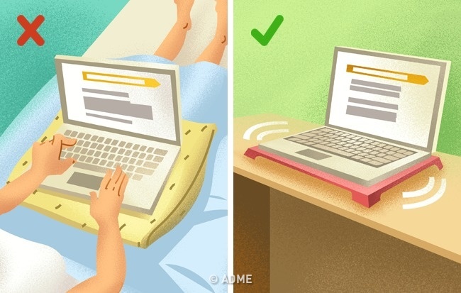 - При використанні ноутбука не слід тримати його на колінах або класти на ліжко. До вентиляційних отворів повинен бути вільний приплив повітря, щоб прилад не перегрівався. Для цієї мети прекрасно підходять спеціальні підставки, деякі з них оснащені вентиляторами.