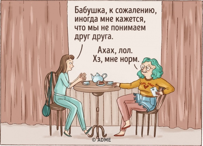 Ми любимо і поважаємо наших бабусь і дідусів, але часто не можемо зрозуміти їх, а вони — нас. Все тому, що вони звикли бачити світ таким, яким він був у часи їхньої молодості, в якому багато було інакше.
