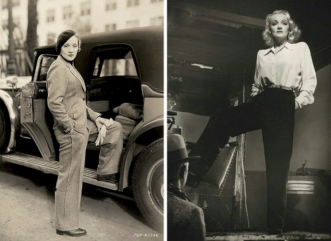 У той час як Кетрін Хепберн надихалася чоловічим одягом, Дітріх буквально сприйняла речі з чоловічого гардеробу. Як би парадоксально це не звучало, але саме такий образ здатний наділити жінку сексуальністю і жіночністю.