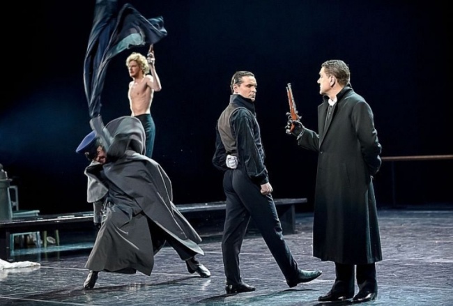 «Євгеній Онєгін». В одній з останніх сцен Євген прибуває на бал до своєму старому другові й бачить Тетяну (у малиновому береті). При цьому звучить наступний діалог: