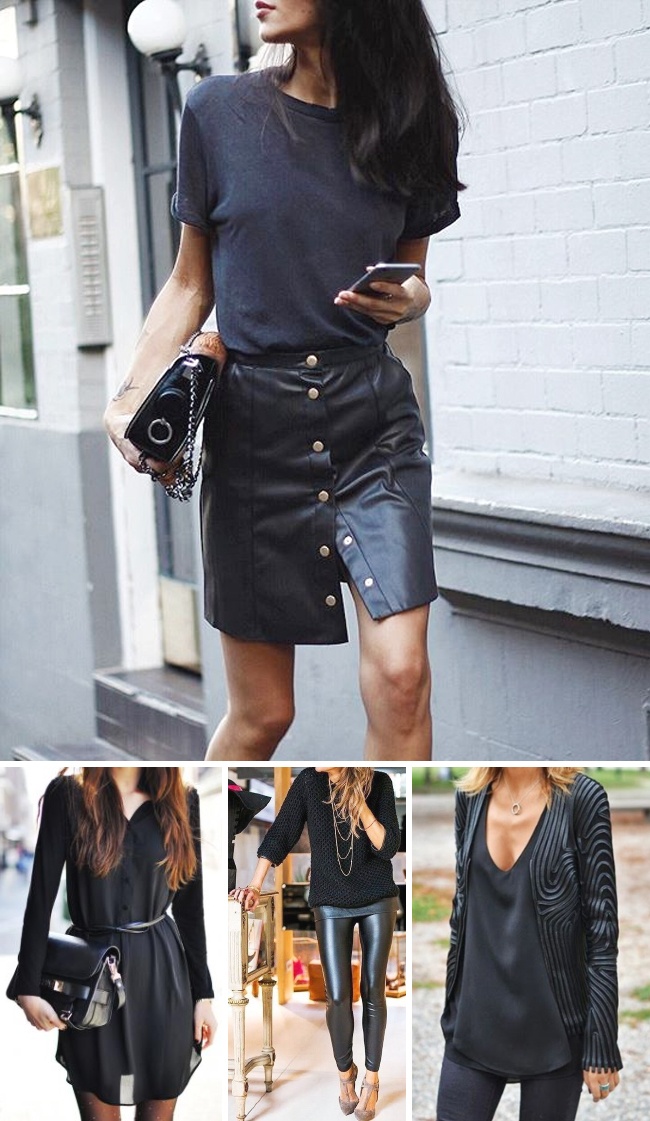 Неймовірно круто виглядає, якщо вдається підібрати речі з різною текстурою. Це можуть бути штани з бавовни і шовкова блуза. Або шкіряна спідниця-олівець, топ з сатину і светр з хорошої вовни. Наряд «тотал блек» відмінно доповнює чорна лакована шкіра — сумочка або туфлі.
