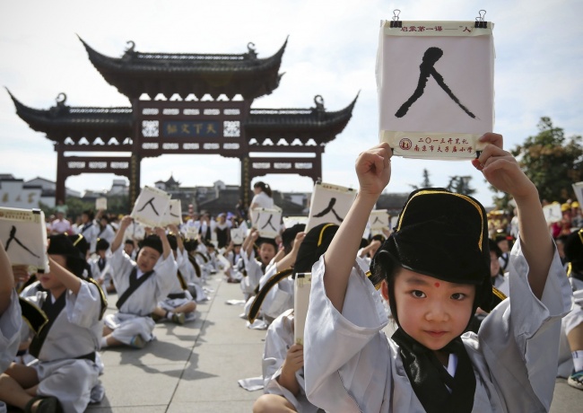 1 вересня першокласники «Школи Конфуція» в Нанкіні приймають участь у церемонії написання ієрогліфа «жень» («людина»), з якої розпочинається їх навчання.