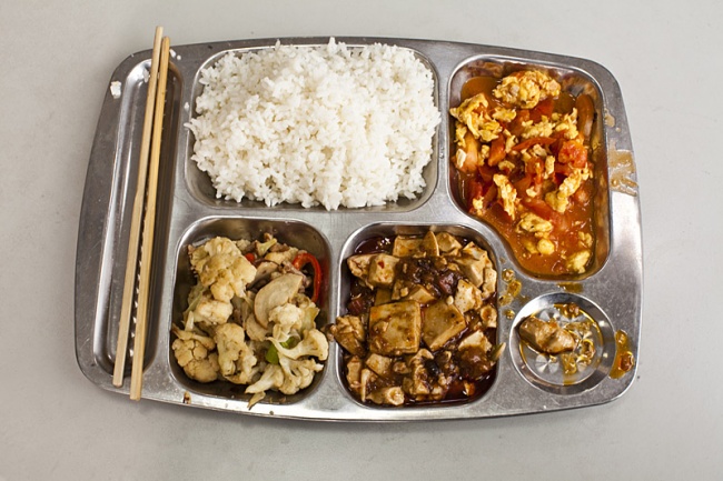 Варіант скромного за китайськими мірками шкільного обіду: яйця з помідорами, тофу, цвітна капуста з перцем, рис.