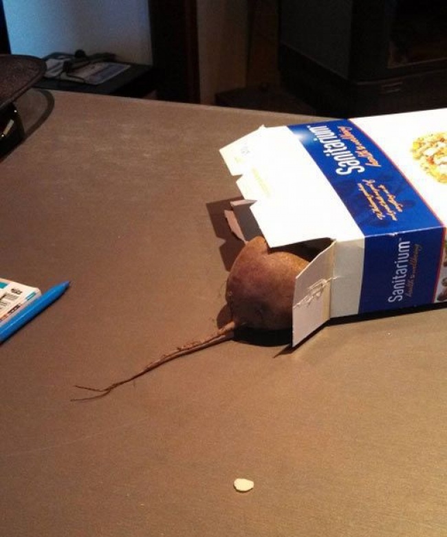 Мишку в будинку зобразити неважко — потрібно «перекинута» коробка і відповідна за розміром буряк з хвостиком. Порада: у відсутності ідеальної буряків можна використовувати картоплину з хвостиком з линви.