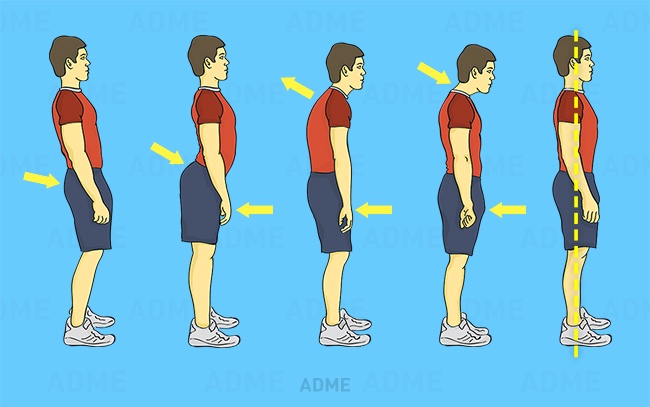 Постарайтеся не сутулитися і стояти найбільш правильно — пряма спина, ноги на ширині плечей, таз злегка попереду, а розгорнуті плечі — позаду. Саме в такому положенні вага тіла оптимально підтримується хребтом. Не тримайте руки в кишенях — це змушує вас сутулитися.