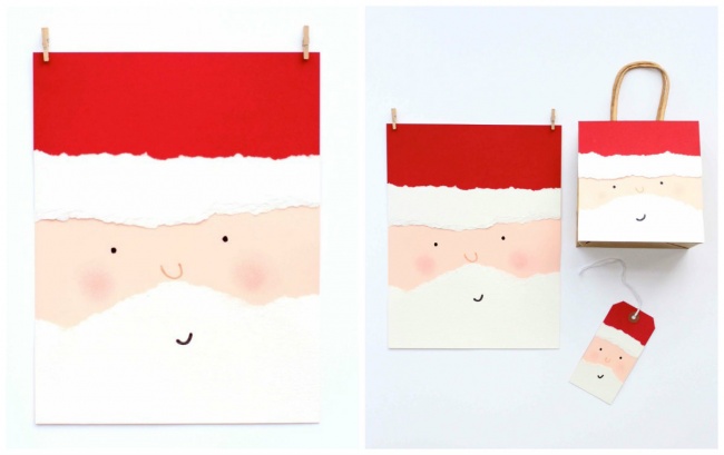 Цього симпатичного Діда Мороза (або Санта-Клауса, кому як подобається) робити простіше простого. Червона шапка і рожеве обличчя — це смужки паперу, наклеєні на листівку або подарунковий пакет. Хутро шапки і борода виходять так: потрібно взяти папір для акварелі (вона пухка, продається в магазинах канцтоварів) і просто відірвати смужки потрібної форми, щоб вийшли нерівні краї. Наклеїти на листівку поверх червоної і рожевої смуг. А потім намалювати дві проблеми — рот і ніс — і дві крапочки — оченята.