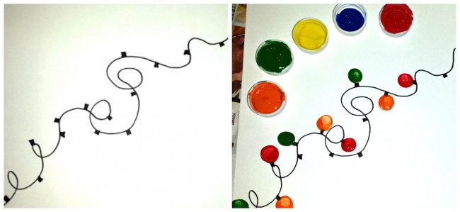 Ще одна проста ідея — ялинкова гірлянда. Спочатку потрібно зобразити шнур, а яскраві вогні дуже просто зробити за допомогою відбитків пальців. Малювати такі листівки, до речі, дуже сподобається дітям, і з ними впораються навіть малюки.