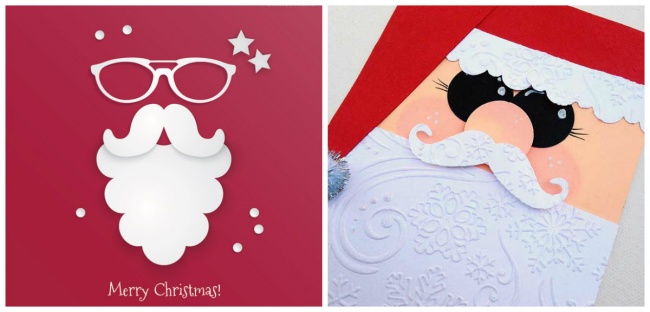 Круто буде виглядати аплікація у вигляді Діда Мороза чи Санта-Клауса. Нам особливо подобається та, що зліва. Для неї потрібно вирізати бороду, вуса й окуляри з білого паперу і посадити їх на кольоровий фон з допомогою двостороннього скотча.