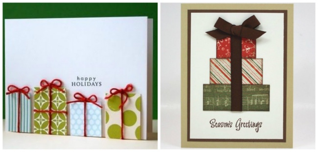 Листівки з подарунками дуже просто зробити з обрізків кольорового паперу і стрічок.