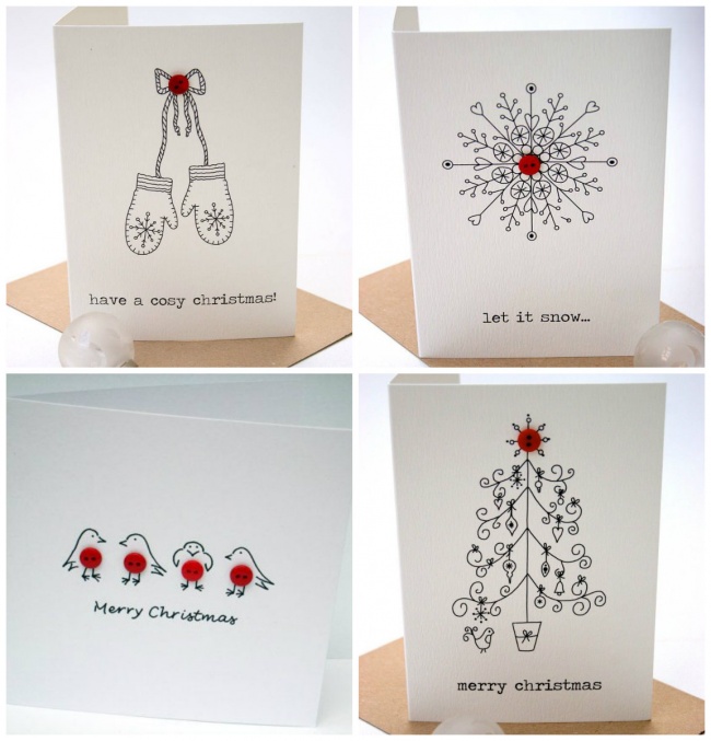 Для того щоб створити ці чудові листівки, вам знадобиться тільки чорна ручка, червоні гудзики і... гарний зразок перед очима.