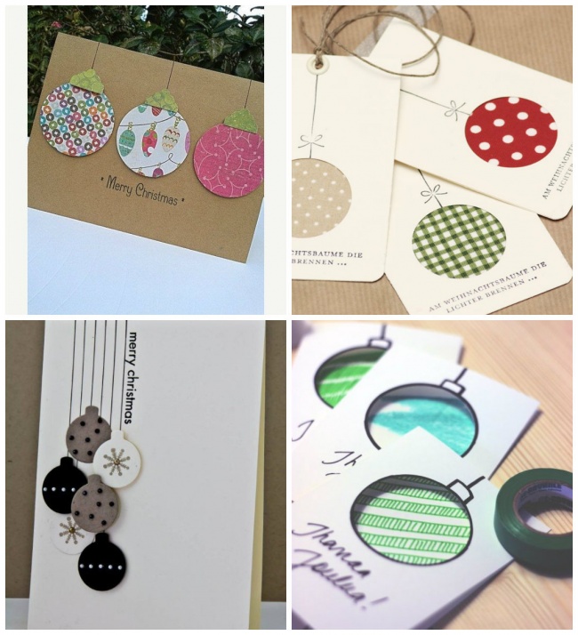 Один з головних символів Нового року — ялинкові кульки — можна зробити з кольорового паперу, тканини або фетру. Ефектними вийдуть прорізні листівки: треба вирізати на лицьовій стороні коло, а на внутрішній намалювати візерунки, приклеїти шматочок тканини або паперу.