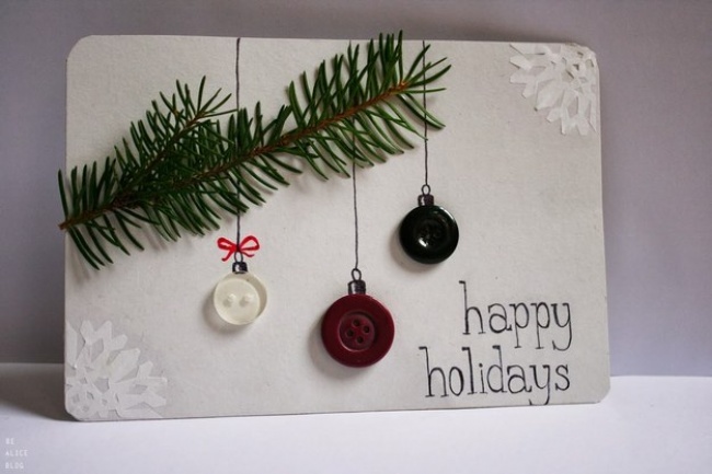 Можемо посперечатися, що у кожного вдома є пильна коробка з різними гудзиками. Діставайте, нарешті-то вони знадобляться: з них вийдуть гарні листівочки. Можна, наприклад, зробити пуговичного сніговика і ялинкові іграшки.