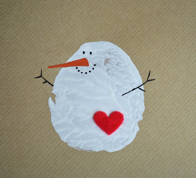 Обсяг цьому забавному сніговикові можна надати, якщо прокласти між колами додаткові невеликі гуртки товстого картону. А якщо є двосторонній скотч, то і картон не потрібен.