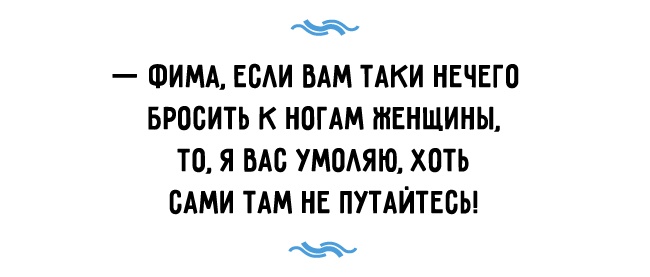 — Сьома, ти зійшов з розуму не на тій зупинці! Що таке букетик троянд? Це через 3 дні — колючий віник! Краще подаруй дівчині мою герань — від неї буде дохнути міль! - — Миття посуду обмежує моє чоловіче достоїнство!