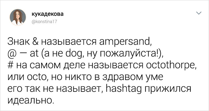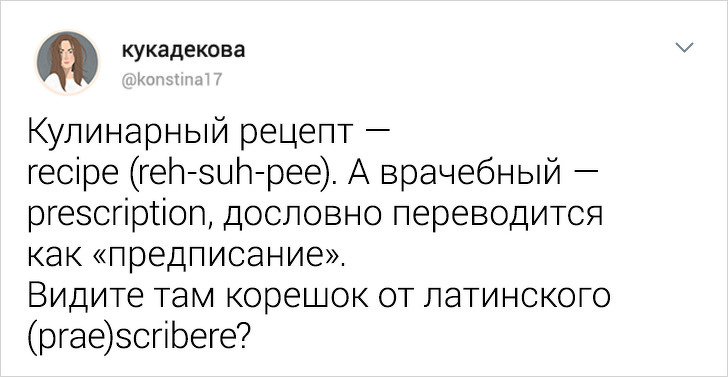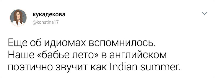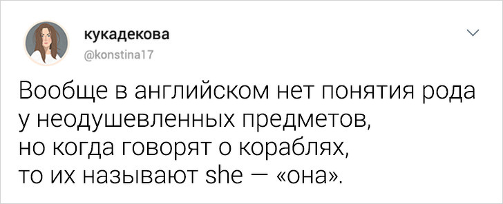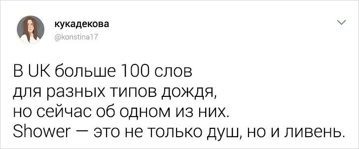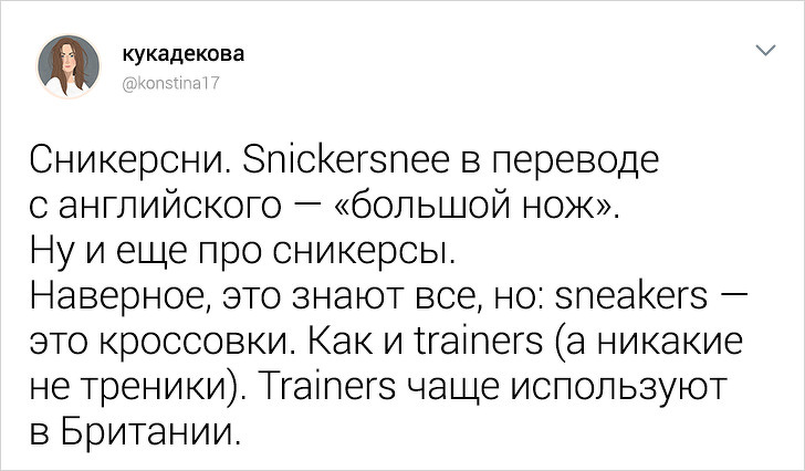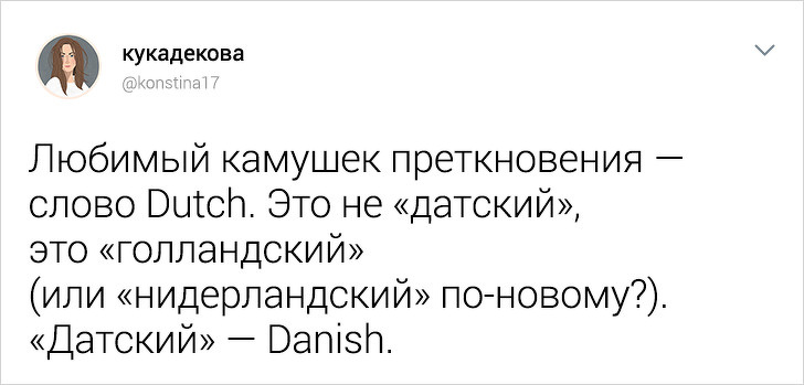 Лінгвіст, викладач іноземних мов і культур Христина Констанденкова публікує в твіттері дивовижні факти про англійською мовою. Іноземні мови — це її стихія з дитинства, книги і фільми вона воліє мовою оригіналу. Цікавиться історією мови і збирає незвичайні факти про нього.