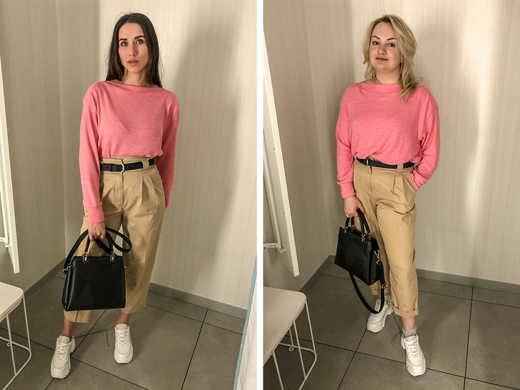 - Брючний костюм в клітину став нашим фаворитом. Коли ми приміряли його, то були в шоці: не стало помітно, що ми носимо різні розміри. Ми зрозуміли: головна помилка багатьох дівчат у тому, що вони бояться носити об'ємні речі.
