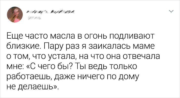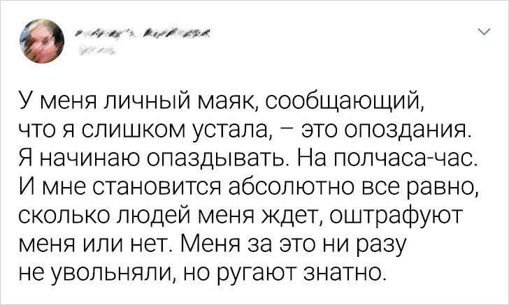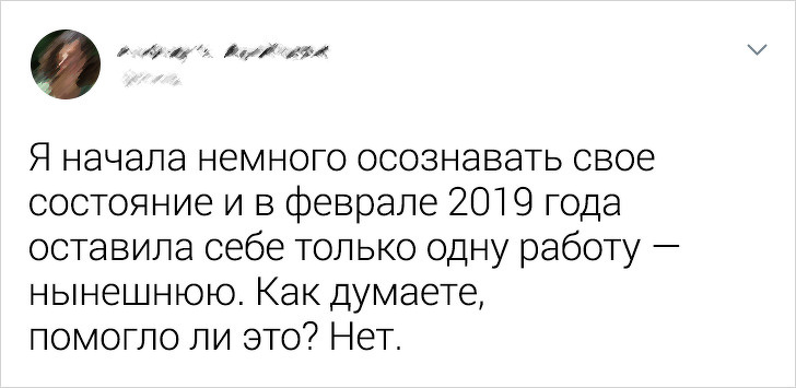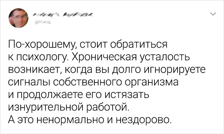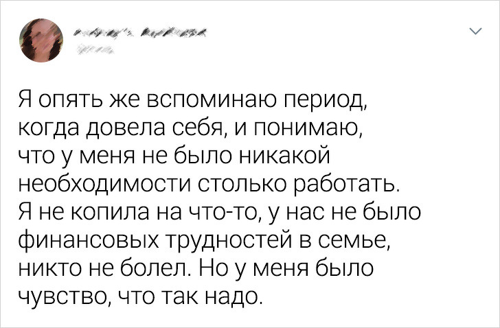 Я не знаю, як це працює, але людина до останнього не хоче визнаватися самому собі, що більше не може. Тому що кредити, оплата квартири, комуналка, поїсти на щось треба. Ймовірно, це пов'язано і зі страхом бути «ледарем».