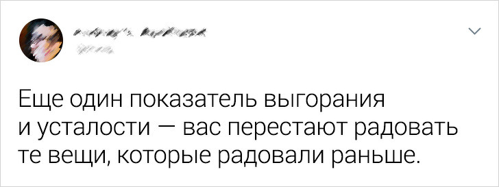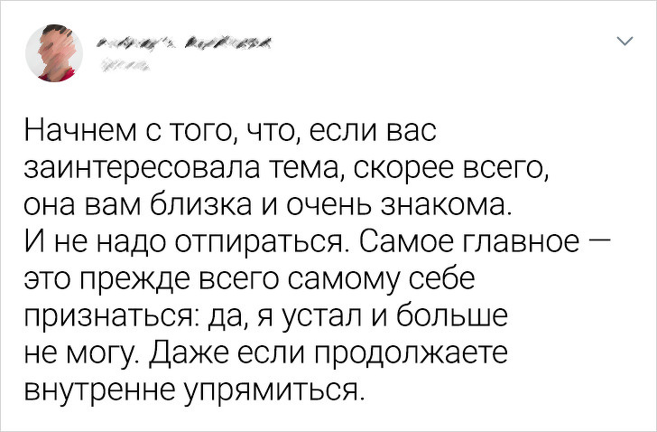 Але для початку потрібно усвідомити, визнати, не звинувачуйте себе, пробачити собі це. Не вважати себе слабким, лінивим і т. д. Немає, люди, ви неймовірно сильні, раз так довго виснажували себе і робили роботу при повній відсутності внутрішніх сил.