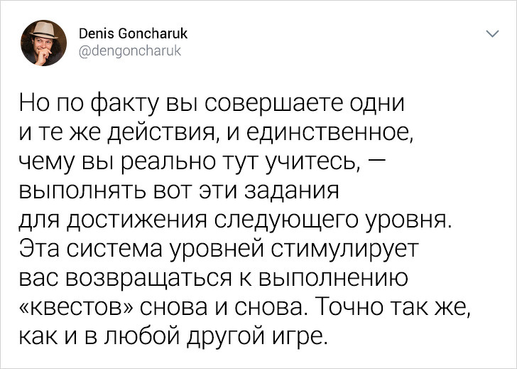 Ця гейміфікація призводить до того, що ви витрачаєте купу часу і грошей на підвищення рівня. Але зовсім не помічаєте, що підвищуєте лише свій рівень у грі, а не рівень англійської. Ви не можете написати текст або вільно говорити, зате круто заповніть пропуски.
