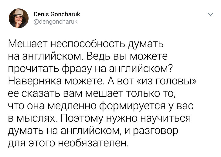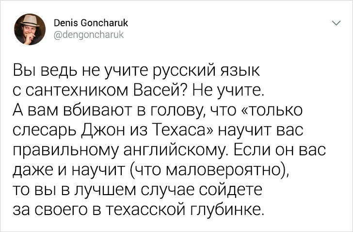 Багато хто з нас мріють вільно говорити англійською мовою: одні ходять до репетитора, інші штурмують підручники або дивляться фільми в оригінальній озвучці. Однак результату досягають одиниці. У чому причина? Викладач англійської мови Денис Гончарук розповів в твіттері про те, як нас водять за ніс численні школи вивчення іноземних мов і яким чином можна оволодіти англійською без допомоги тьютора.
