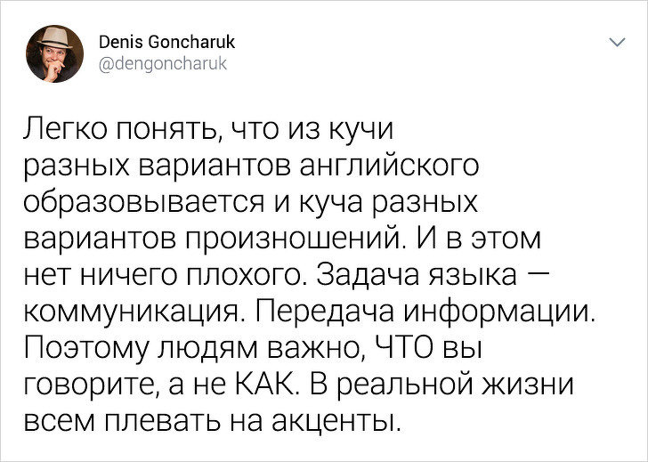 З цим пов'язаний міф про те, що є «правильна» версія англійської, якою можуть навчити тільки носії мови. Але англійська — рідна мова не тільки для британців і американців. Ще для індусів, канадців, камерунців, австралійців... Ці версії дуже відрізняються один від одного.