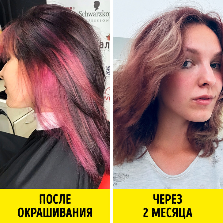 Одна наша постійна клієнтка довго фарбувалася в рудий, а потім вирішила змінити колір волосся на фіолетовий. Ми «змивали» її 3 рази, потім фарбували, потім тонували. Волосся у неї були до середини лопаток, процедура зайняла 6 годин. Протягом року дівчина мучилася з підтримкою кольору і укладанням — відтінок вимивався в брудно-рожевий, а волосся поламалися, стали пухнастими і неслухняними.