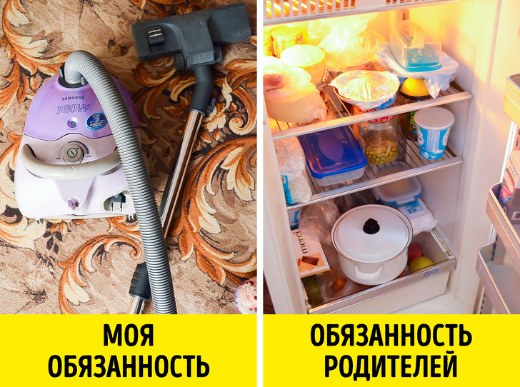 Виконання домашніх справ поодинці сильно вимотує, а коли ви живете втрьох, обов'язки можна розділити між усіма членами сім'ї. Приміром, я роблю прибирання, а батьки ходять за продуктами і т. д.