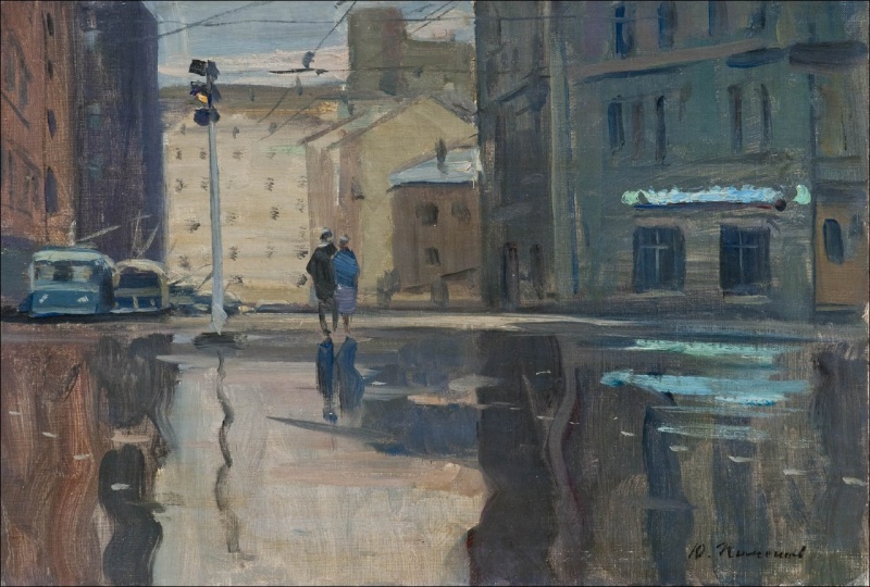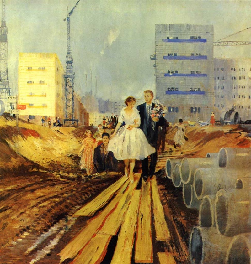 Живописець Юрій Піменов на своїх полотнах поетично зобразив трудові будні країни та її героїв. Піменов — імпресіоніст і, як і всі його колеги, ставить у главу кута мить. Сяючий мить, що вміщає в себе весь світ і безліч смислів. Картини його дуже життєрадісні, світлі, ловлять в свою застигла вічність якісь секунди з життя простих людей і показують їх іншим.