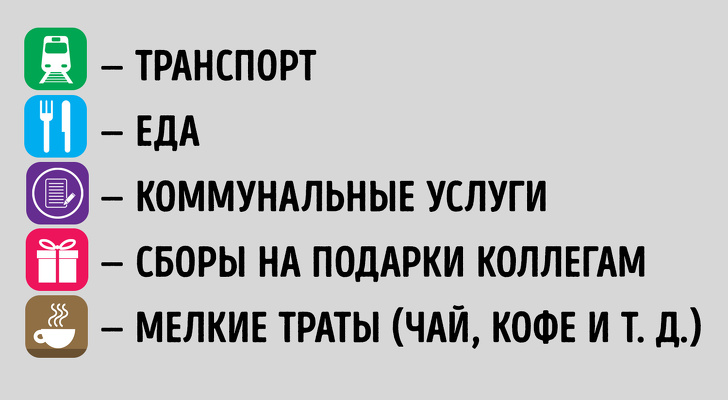В неділю ввечері ми зустрілися і підрахували всі витрати за минулий тиждень. Вова, працюючи в офісі, витратив ₽ 4 867, а я, сидячи вдома, — ₽ 5 439. Різниця не дуже суттєва, але ми пам'ятаємо, що це витрати за тиждень. В місяць набігає сума, порівнянна з тією, що ми залишаємо раз в тиждень в супермаркеті.