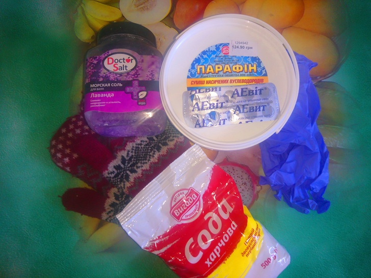 Мені знадобилося: косметичний парафін, сода, морська сіль, кілька видів масел, теплі рукавички, 2 пакетика, вітаміни А і Е (аевіт).