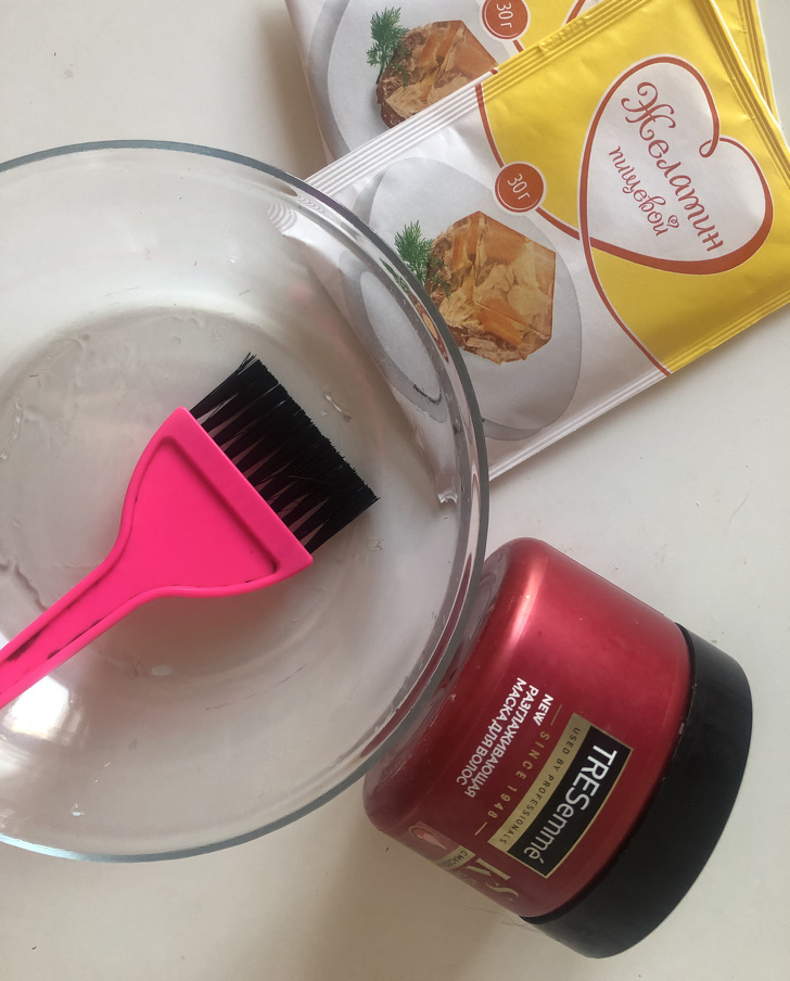 Маска для домашнього ламінування робиться просто: потрібно змішати 3 ст. ложки желатину, 9 ст. ложок води і 3 ст. ложки бальзаму. Нанести на вологі волосся, накрити голову пакетом, зверху — рушником і через 35 хвилин все ретельно змити.