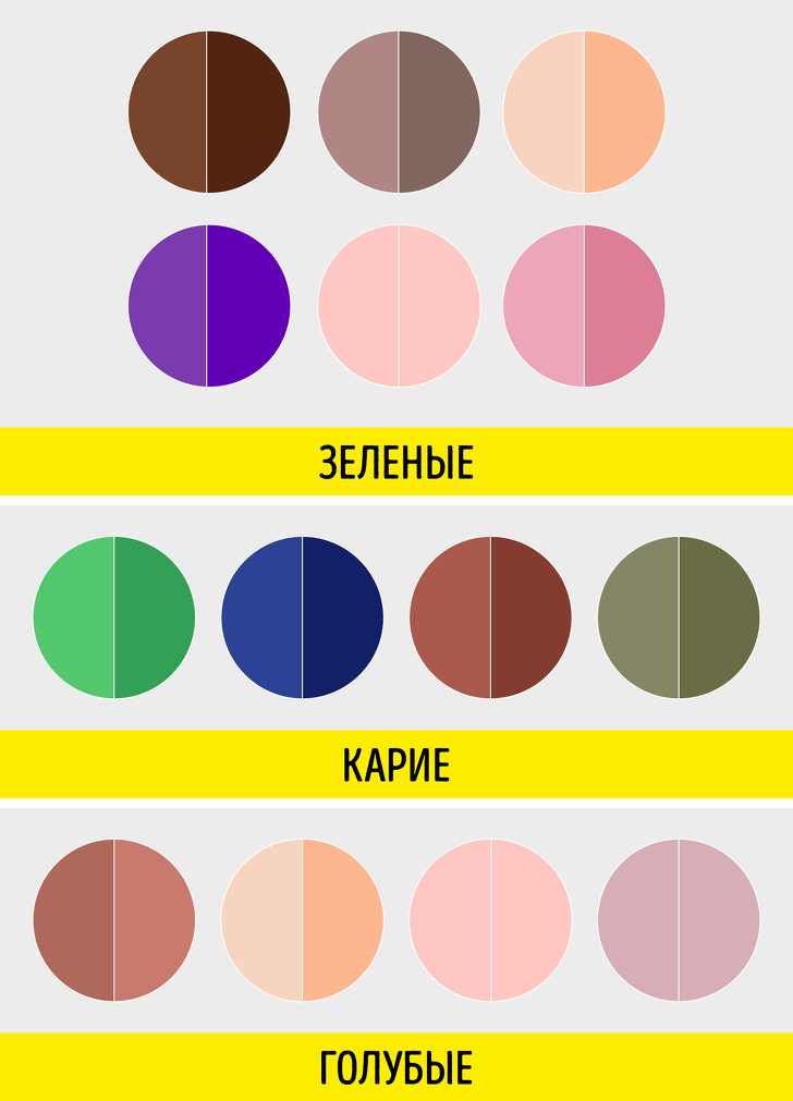 Колірна гамма для карих, блакитних і зелених очей повинна бути підібрана так, щоб не виходило «масло масляне». Краще всього вибирати для макіяжу тіні контрастних відтінків.