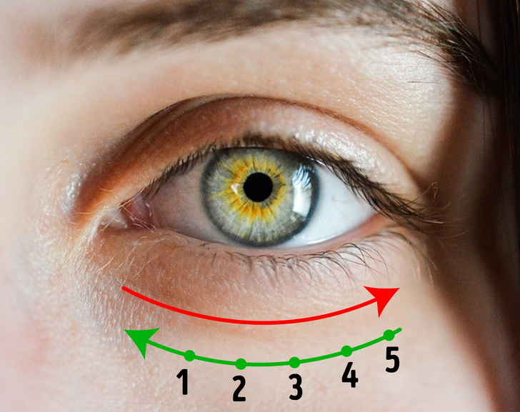 По-перше, так буде менше розтягуватися шкіра, а по-друге, ви задіюєте «точки краси» на кругового м'язу ока. В результаті ви зробите невеликий лімфодренажний масаж повік. Головне, пам'ятайте, що рухи пальців повинні бути круговими, м'якими і легкими.