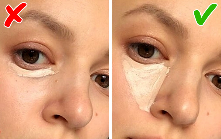- Неможливо отримати свіжий колір обличчя, якщо намазати консилер прямо під очима. Це засіб належить наносити на зону «голлівудського трикутника» (як на фото).