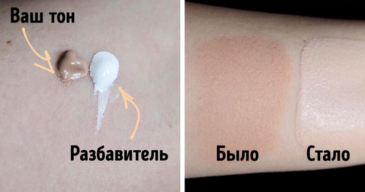 У багатьох з нас з літа залишається улюблений тональний крем темного відтінку. А до осені засмага вже починає вицвітати, і нам потрібно вже звичний більш світлий тональник. Якщо не хочеться викидати «літній» тюбик, можна використовувати спеціальний розріджувач тони. Його належить змішувати з тоном до отримання потрібного відтінку. Цей лайфхак використовують і у випадках, коли потрібно освітлити особа, яка загорело сильніше, ніж руки і шия.
