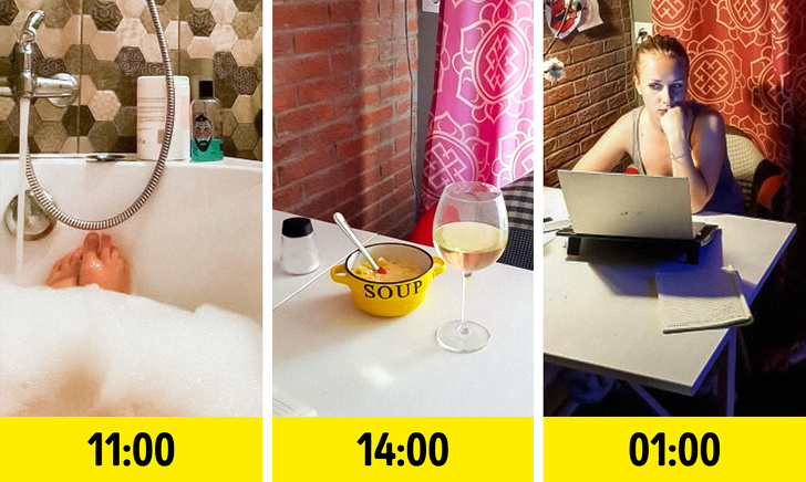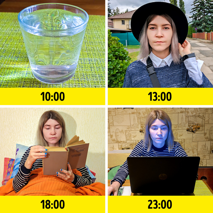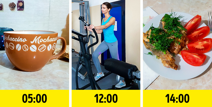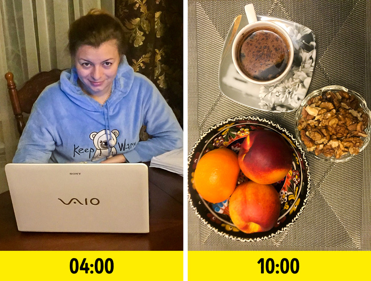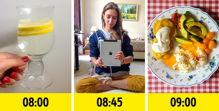 Починати день зі склянки води мені зовсім не сподобалося: сильно не вистачало кави. Та й залишатися в ліжку ще якийсь час після пробудження було дивно. Я відчувала такий дискомфорт, що мені просто хотілося кинути всю цю затію. Відразу після їжі — прогулянка, і це цікаво. А потім почалася моя улюблена частина — читання. Причому читання протягом 4 годин! Вечеряла з сім'єю, а потім ми всі разом просто дивилися кіно. У 10 вечора я пішла працювати. Це так дивно! Але, на подив, голова моя була зрозуміла, а от часу мені не вистачило: в годину ночі пора було лягати спати, хоча я б посиділа ще пару годинок.