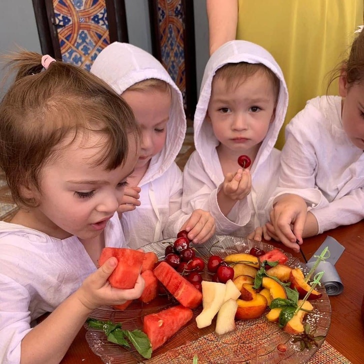 Сніданок в 8 ранку: каша, яка все одно не завжди з'їдається, і натомість вони вимагають хліб або печиво. Потім в 12 обід. Суп, лаваші або макарони з котлетою чергуємо, так як після декількох днів вони починають відмовлятися від їжі. Після сну перекус, потім в 19:00 вечеря, що складається з тих же каш або макаронів: не їдять більше нічого. Єдине, що можуть є завжди і в будь-якій кількості, — полуницю і банани!
