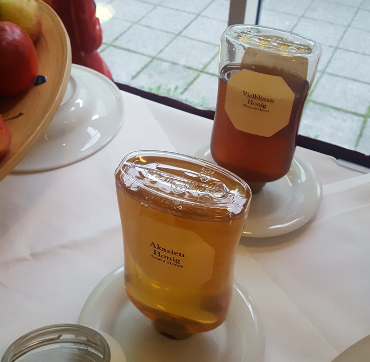 Акацієвий мед на передньому плані і квітковий — на задньому.