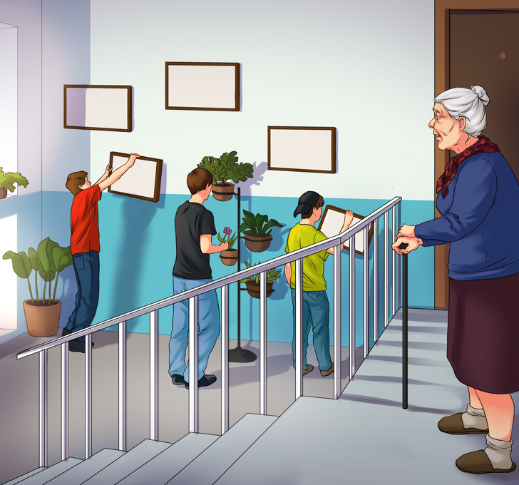 На наступний день вона знову поставила квіти, повернула рамок колишній вигляд і поклала на підвіконня книги. Класику. Прийшли підлітки. Галасували, шуміли. Вона вийшла і... запропонувала їм чай зі своїми пляшками, апетитними і смачно пахнуть. Хлопці не змогли відмовитися. І навіть викрали з собою книги з обіцянкою прочитати. Квіти вони не чіпали, рамки — теж. На наступний день вона винесла пластикову пляшку з водою, щоб кожен, хто вирішить подбати про кольорах, зміг їх полити. І... нові книги. Увечері прийшли підлітки, обливали один одного водою, реготали і галасували. Бабуся знову вийшла до них і запропонувала чаю, булочок, забрала пляшку, наповнив її водою і попросила їх полити квіти. Хлопці стали приходити в під'їзд кожен день. Сусіди обурювалися, навіть викликали міліцію, але бабуся сказала, що це, мовляв, до неї, її учні прийшли за книжками, роздала при міліціонерів книги розгубленим підліткам і проводила міліцію: «З богом!»